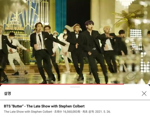 3) Stephen Colbert 쇼 - 2021.05.26 약 1600만 뷰(쇼 채널) + 1200만 뷰(방탄 채널)