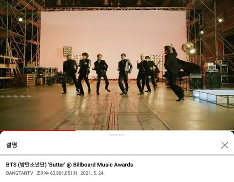 1) 빌보드 뮤직 어워드 - 2021.05.24 : 약 6300만 뷰 (방탄 채널에만 올라옴)