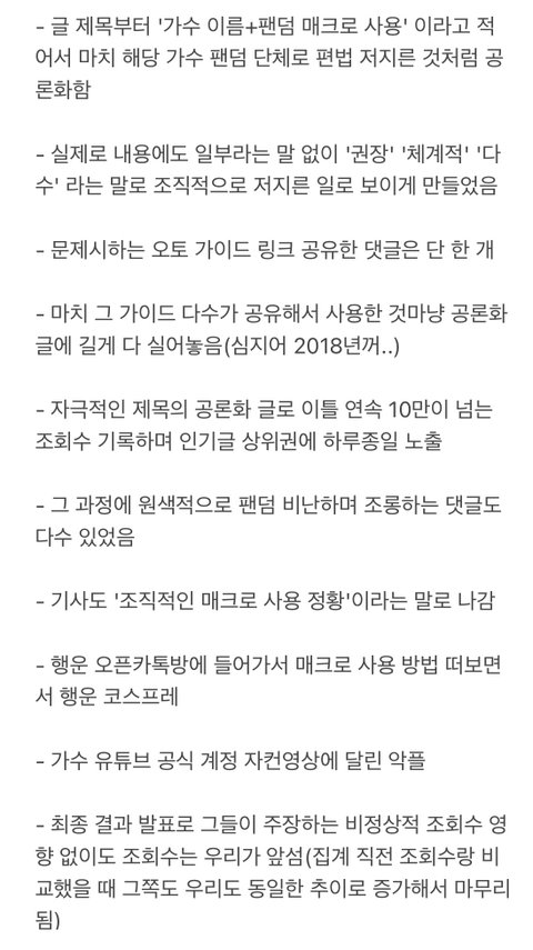- 글 제목부터 '가수 이름╋팬덤 매크로 사용' 이라고 적어서 마치 해당 가수 팬덤 단체로 편법 저지른 것처럼 공론화함 - 실제로 내용에도 일부라는 말 없이 '권장' '체계적' '다수' 라는 말로 조직적으로 저지른 일로 보이게 만들었음 - 문제시하는 오토 가이드 링크 공유한 댓글은 단 한 개 - 마치 그 가이드 다수가 공유해서 사용한 것마냥 공론화 글에 길게 다 실어놓음(심지어 2018년꺼..) - 자극적인 제목의 공론화 글로 이틀 연속 10만이 넘는 조회수 기록하며 인기글 상위권에 하루종일 노출 - 그 과정에 원색적으로 팬덤 비난하며 조롱하는 댓글도 다수 있었음 - 기사도 '조직적인 매크로 사용 정황'이라는 말로 나감 - 행운 오픈카톡방에 들어가서 매크로 사용 방법 떠보면서 행운 코스프레 - 가수 유튜브 공식 계정 자컨영상에 달린 악플 - 최종 결과 발표로 그들이 주장하는 비정상적 조회수 영향 없이도 조회수는 우리가 앞섬(집계 직전 조회수랑 비교했을 때 그쪽도 우리도 동일한 추이로 증가해서 마무리됨)