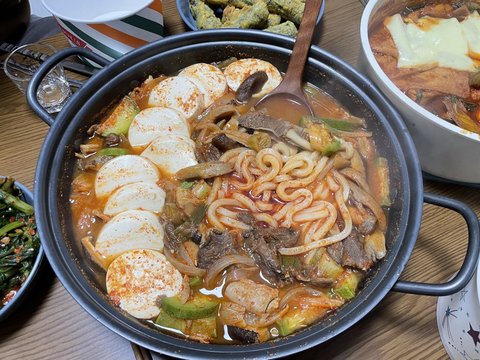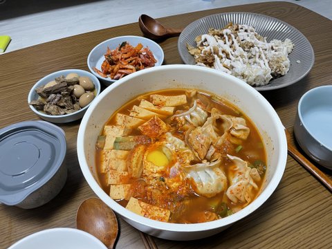 만두전골과 치킨마요.