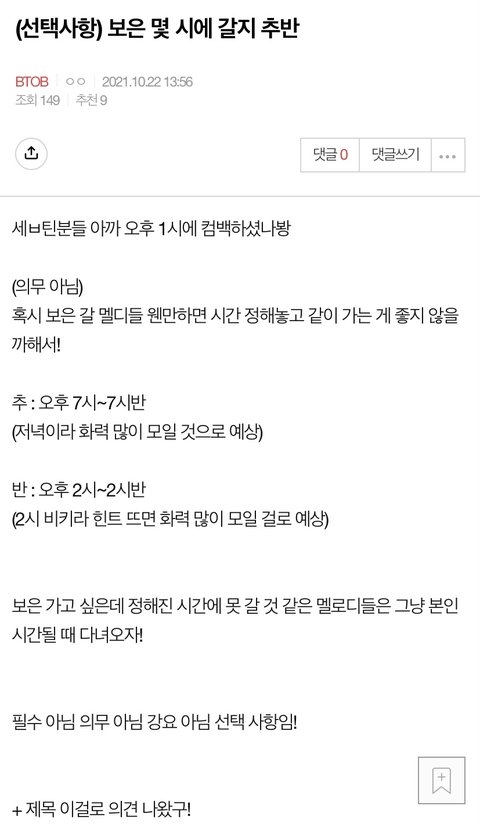쓰니는 아닌데 1시간 정도 남기도 했고 넘어갔길래 적어봐! 아무래도 7시로 결정난 것 같아서... 보은 제목은 이거래 ❤️난 밤새도록 캐러멜과 rock with you❤️ 절대 강요 아니야!