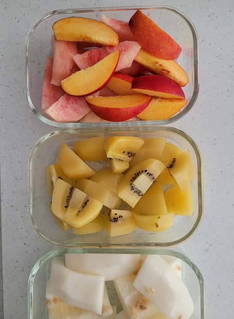냉장고에 과일을 썰어두면 아이가 쉬는시간에 나와서 하나씩 꺼내먹어요^^ 아이가 혼자 집에 있는 시간.. 함께 하지 못하지만 이렇게 엄마마음을 전하고 옵니다~