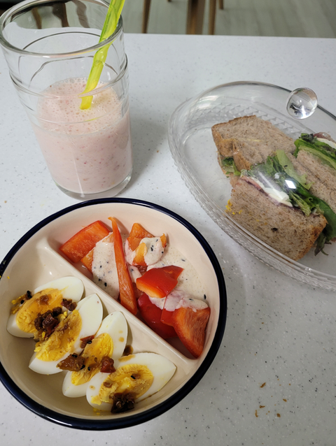 전날 고기쌈 먹다 남은걸로 아침에 샌드위치를 만들어봤어요. 딸기잼도 냉동딸기로 만들어봤는데 맛있었어요~ 역시 과일은 제철과일이 좋죠~