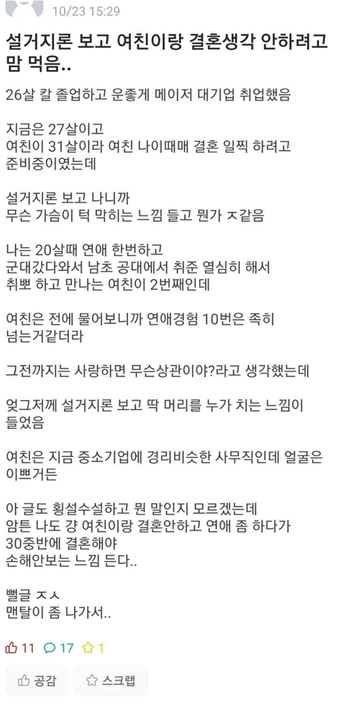 그럼 예뻐서 연애경험 많은여자 말고 니랑 똑같은 못생기고 공부만해서 연애경험없는 여자랑 결혼하면되자나 ㅋ 지가 예쁜여자 원했으면서 연애경험 많다고 설거지 ㅇㅈㄹ 니가 못생겨서 연애경험없는걸 탓해~ 공부만해도 잘생기면 연애경험 많아 ㅠ 그리고 저런찐따랑 과연 그 예쁜여친이 결혼해줄까 싶음 한남 특유의 자의식과잉 아닐까..나이마저 먹으면 늙은 찐따남이랑 결혼해줄 비위좋은 여잔 요즘세상에 없음