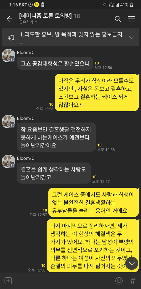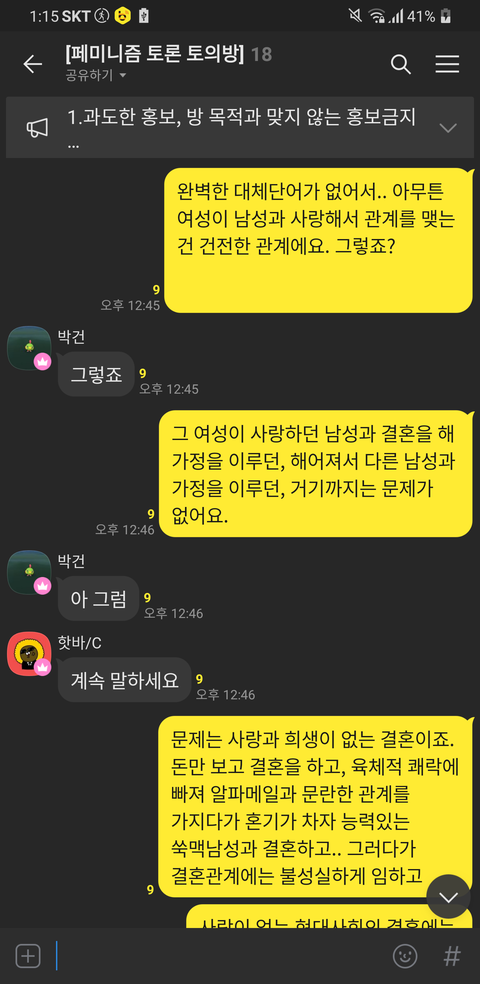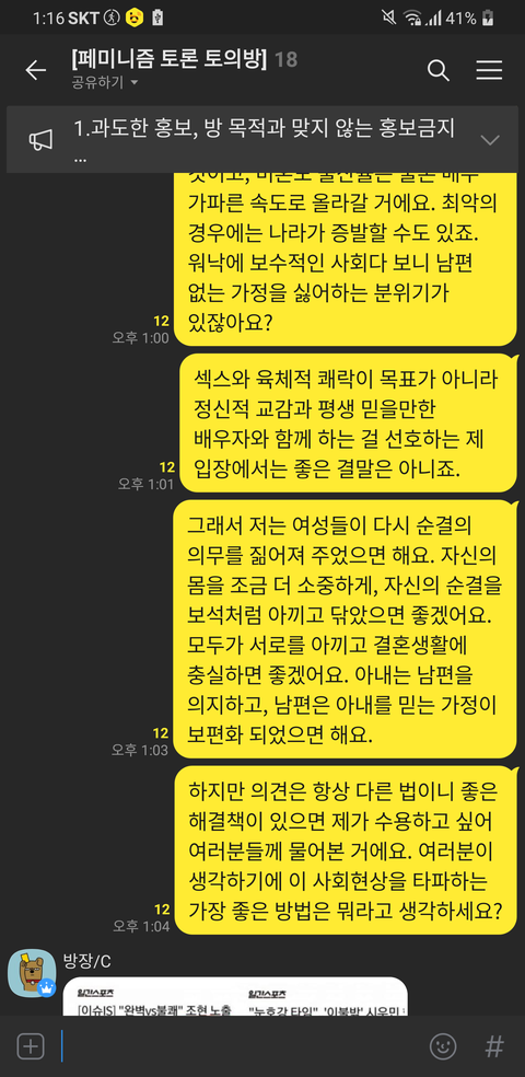 위의 톡 내용을 보면 알 수 있듯이 제 의견은 이렇습니다. 여러분이 생각하기에 지금의 사회적 현상, 결혼을 했음에도 서로를 불신하고, 온전히 마음을 다해 사랑하지 못하는 이 상황을 어떻게 해결할 수 있다고 생각하세요?