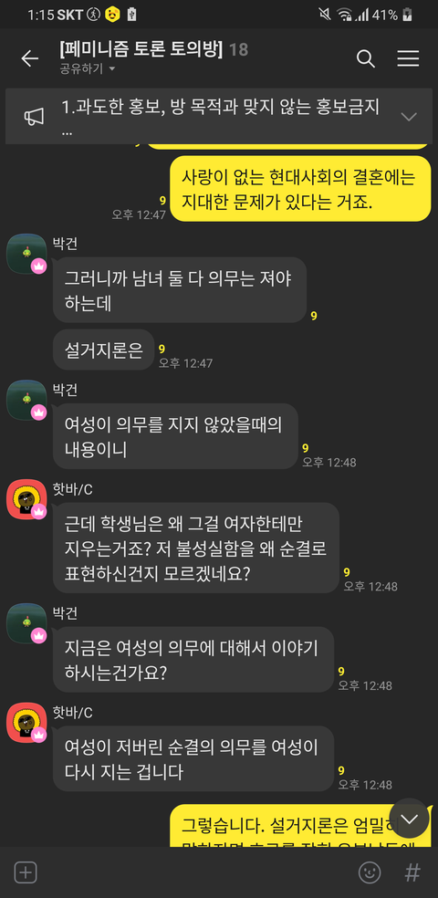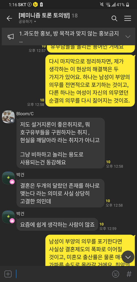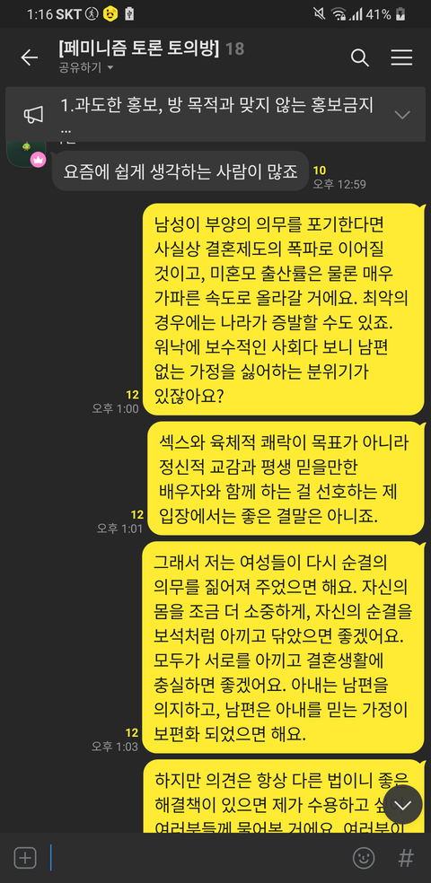 위의 오픈톡 내용을 보면 알 수 있듯이 제 의견은 이렇습니다. 여러분이 생각하기에 지금의 사회적 현상, 결혼을 했음에도 서로를 불신하고, 온전히 마음을 다해 사랑하지 못하는 이 상황을 어떻게 해결할 수 있다고 생각하세요?