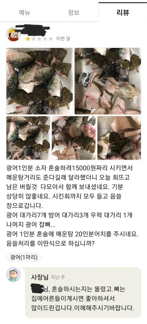 엿먹으라는거지 엄연히 광어 1인분을 시켰는데 혼술하는지 몰랐다? 몰랐다고해도 저 정도 양이면 매운탕 몇십인분을 끓일수 있는 양 아님? 음쓰처리했다고밖에 안 보임. 생선 대가리넣고 끓이면 국물이 시원하고 나발이고.