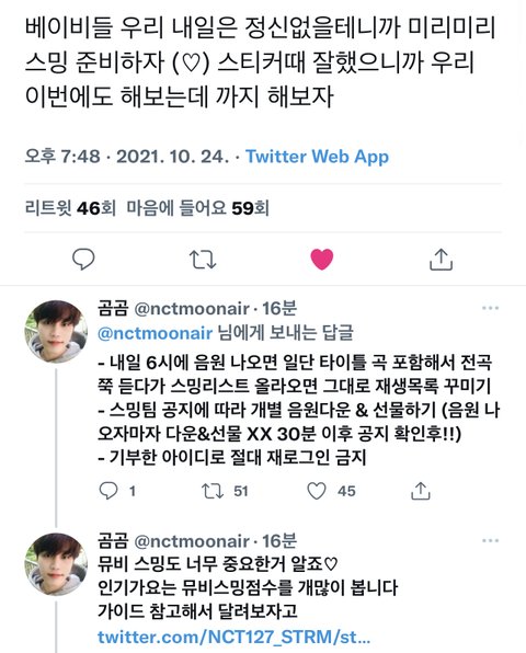 스밍팀도 그렇고 몇몇 분들이 자세하게 설명해주신 글들 있으니까 혹시 헷갈리면 꼭 읽어줘 https://twitter.com/nctmoonair/status/1452225439720632321?s=21
