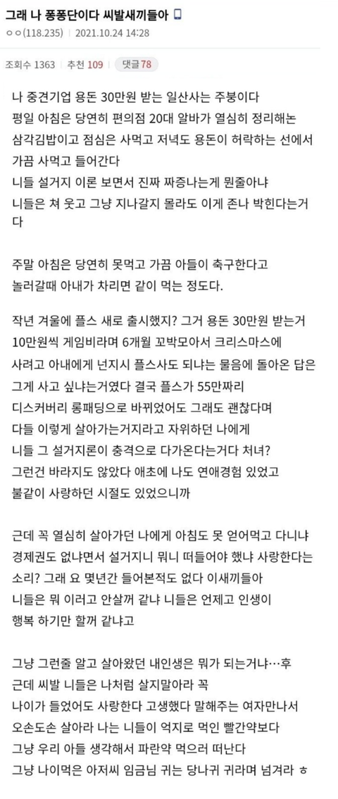 주갤하는 ㅎㅌㅊ남자니까 그렇지.. 차은우급 존잘 전문직아내들이 저럴거같나? 즈그 부인아니었으면 니 애기 누가 까줬을라고.. 걍 끼리끼리 만난거지 본인이 그 수준이니 부인도 지수준에 맞는사람 만난건데 한탄은 ㅋㅋㅋ