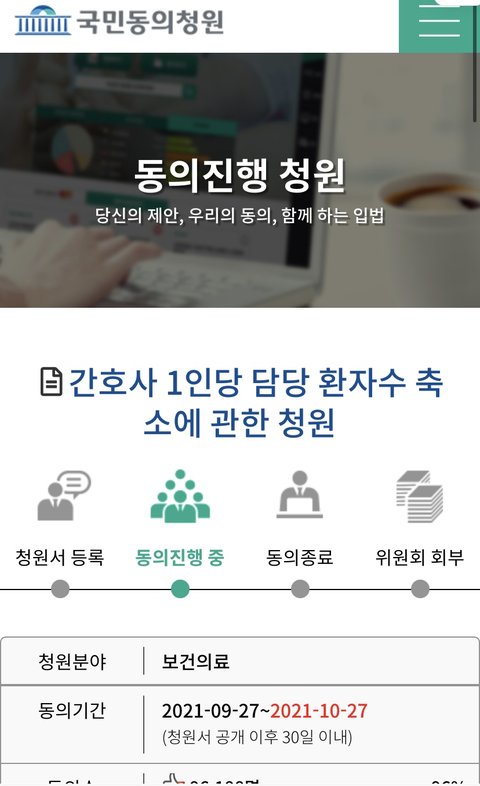 간호사 1인당 환자수 축소 청원인데 해주라ㅜㅜㅜㅜ 간호학과 지망생으로서 매우 간절… 90몇퍼라 곧 100퍼됨.. 부탁해 고마워 널리 퍼트려줘