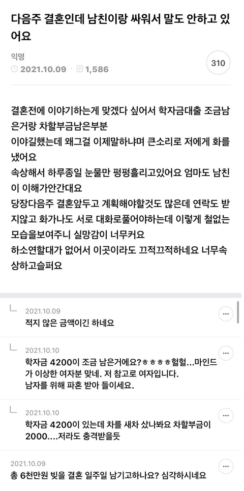 제목 그대로요. 당장 다음 주가 결혼인데 예비신랑이 이제와서 빚 있다는 얘기를 했어요. 차라리 초반에 말했다면 제가 방법이라도 생각했을텐데 다음 주가 결혼인데 왜 그걸 이제 말하냐고 저도 모르게 큰 소리로 화를 냈어요. 지금 계획하고 의논할 다른 문제도 많은데 너무 짜증나고 다 엎고 싶어서 계속 연락오는 것도 안 받고 있어요. 오히려 예비신랑은 다른 빚도 아니고 공부하느라 학자금 대출 조금 남은 거 4200만 원이랑 차 할부금 2000만 원 정도 남은 건데 오히려 저보고 다음 주가 결혼인데 제가 잠수타버렸다고 저보고 왜 이렇게 철이 없냐면서 저한테 실망감이 든대요. 자기 엄마(예비시어머니)도 제가 이해가 안 간다네요. 제 스스로 너무 무책임하게 행동한 거 아닌가 싶지만서도 몇 백도 아니고 6000만 원 빚을 결혼 일주일 전에 알게돼서 너무 혼란스럽고 결혼을 하기도, 안 하기도 싫고 그냥 아무것도 하기가 싫어요. 예비신랑은 하루종일 속상하다고만 하고 어떻게 해야 이 문제를 해결할 수 있을지 여러 의견을 구하고 현명한 답을 찾고 싶어서 글 써봐요.
