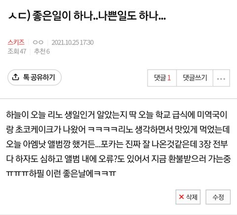난 앨범에도 땡스투 두번씩 적힌 오류가 있어서 앨범은 교환됐는데 결국 포카는 못바꿨다...ㅜㅠㅜ(사실 그 하자도 내가 일부러 낸다고 해서 생길 흠집은 아닌데...)