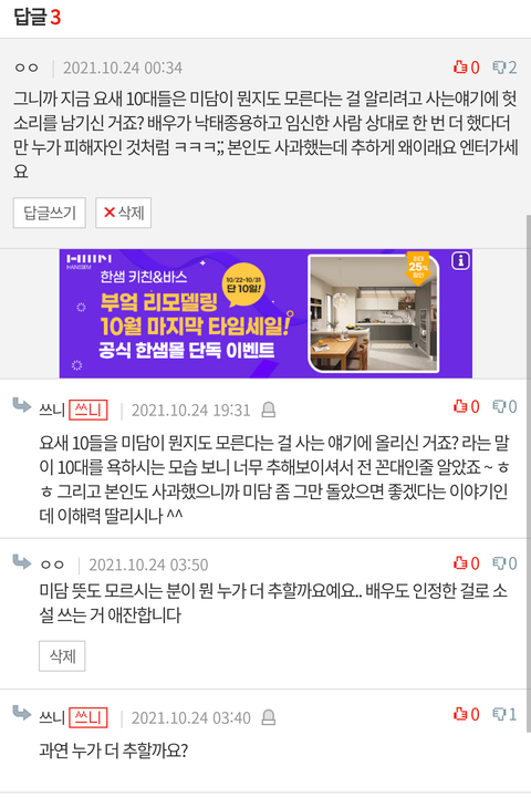 김선호 팬들 줌마 아니라고 발악하는 거 개웃김 아닌데? 나 학식인데? ㅇㅈㄹㅋㅋㅋㅋㅋㅋㅋ 줌마아닌척╋김불호팬 아닌척 며칠을 판에 상주하면서 지들끼리 추천누르고 베댓만들어서 톡선올리고 ㅋㅋㅋㅋㅋ 그럴수록 김불호 이미지만 ㅈ창나는데 그걸 모르나봄