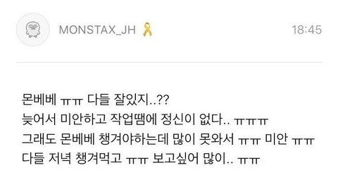 주헌이 정말 쎄게 생겼지만 진짜 여린애고 사랑받는걸 좋아하는 아이야 그리고 언제나 몬베베 생각하며 좋아할만한거 꼬박꼬박 올려주고 몬베베들이 원하는거 다 최대한 해줄려고 하고 멤버들에게도 가장 사랑 많이받고 귀여움 많이 받는 애기야 진짜 그리고 본업은 다들 알다시피 진짜 잘하는데 랩뿐만 아니라 노래도 잘하고 특히 댄스! 원래 댄스로 스쉽 들어올 정도로 댄스 잘하고 연습생들 사이에서 천재 들어온다고 할정도로 유명했고 작곡 작사도 잘하고 끊임없이 노력하는 귀요미야 주헌이 많큼 사랑스러운 사람 없다고 생각해... 진짜 귀요미 꿀떡이 많이 사랑해줘 말투도 용궁체라고 맨날 ~용~궁 이라고 말하는 아가야