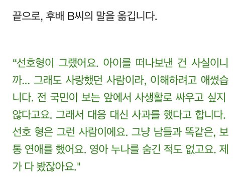 5. 이 모든 사실을 김선호는 전 애인에 대한 배려로, 그리고 어쨌튼 아이를 떠나보낸 것을 사실이니 사생활로 뉴스에서 싸우고 싶지 않아 인정