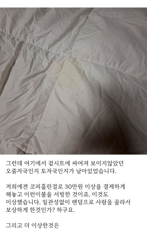 3. 집에 가는길 고속도로에서 이불을 못쓰게되었으니 30만원을 배상하라는 연락이 왔습니다. 코로나 방역지침상 어쩔수 없다고 하여, 제가 강릉시 지침이냐고 물어봤더니 갑자기 말을 바꾸어 이불에 피가 묻은것이 지워지지 않으니 파손으로 처리되는것이 내부규정이라고 앵무새처럼 말을 반복하여, 돈을 내놓던지 똑같은 이불을 구해오라고 말을했고, 마지막엔 "어차피 폐기처분될 이불이니 보내드릴까요?" 그래서 얼마나 피가 심하게 안지워지면 그럴까 해서 알았다고 말하고 이불을 기다렸습니다.