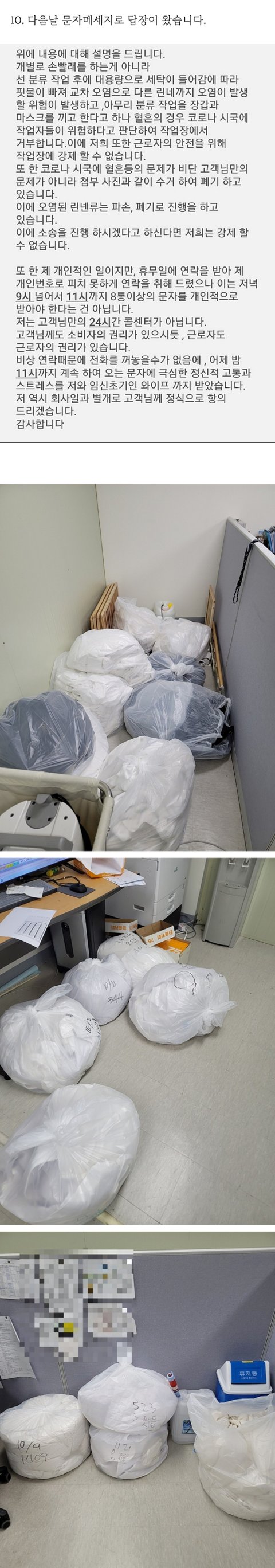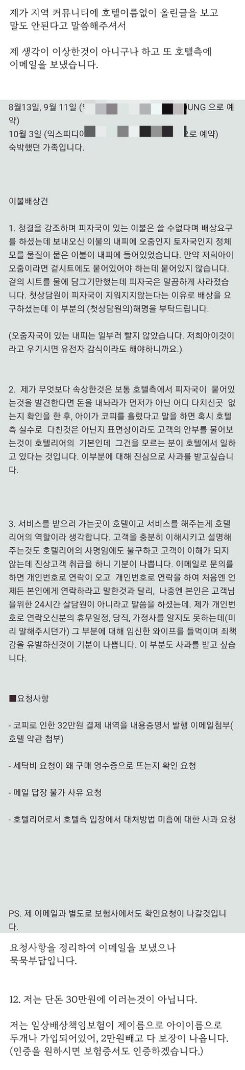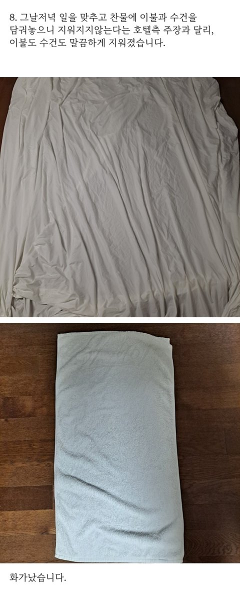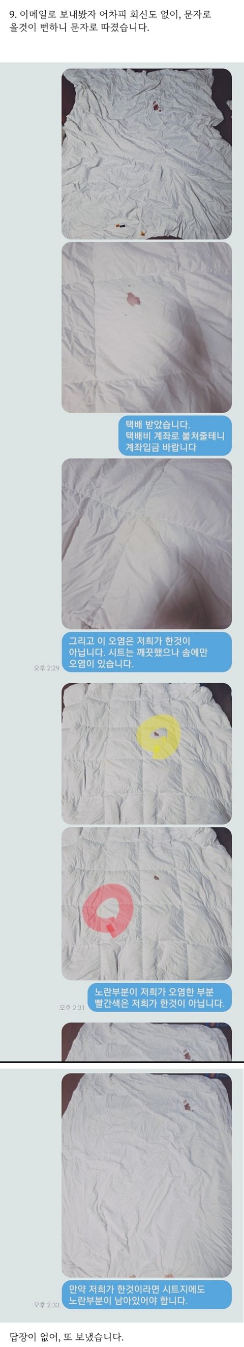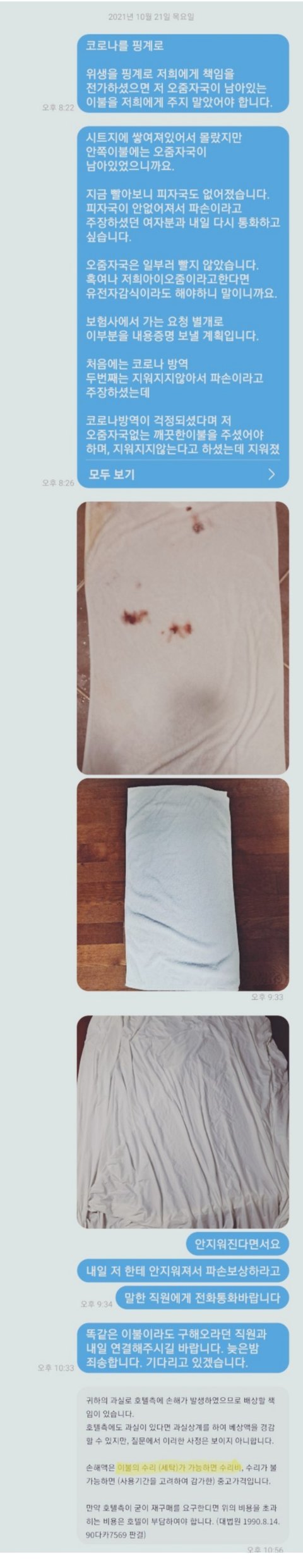 4. 10월11일까지 이불을 보내지 않아(아시다시피 피는 오래될수록 지워지지않습니다.) 밤에 호텔에 전화하여 상담을 하니 담당자가 없다고 내일 전화드린다고 하여 끊었습니다. 이때 제가 낸 숙박비에 세탁비가 포함되어있으니 돌려달라고 주장도 하였습니다.