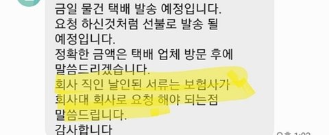 5. 10월12일 오후 1시 26분 경 직책도 이름도 밝히지 않은 담당자의 개인번호로 세탁비는 돌려줄 수 없다하여, 저는 일상배상책임보험을 받을 수 있게 서류를 받을 수 있냐고 물었더니 영수증은 보내줄수 있지만 본사의 직인이 찍힌것은 상부에 보고가 올라가야 하니 안된다고 앞으로 이일에 대해 궁금한점이 있거나 보험관련은 자기 번호로 언제든지 연락하라는 답변을 받았습니다.