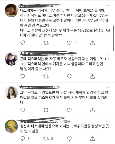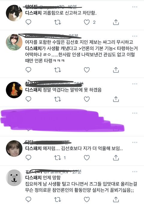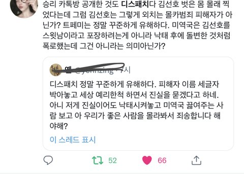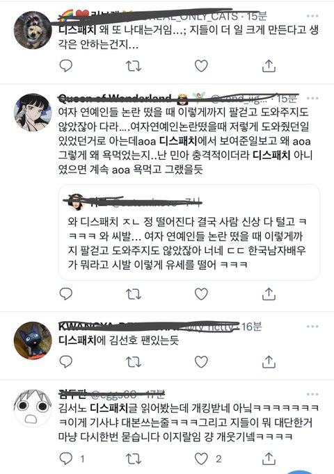 김선호 디패 반박 기사 나오고서 트위터만 저 ㅈㄹ남. aoa기사 냈던것도 디패인데 왜 남자연예인만 쉴드쳐주냐고 징징대고, 이제 뜨던 배우 거짓말로 이미지 망쳐놓은거에 반박 기사 내준거 가지고 어차피 뒷돈인데 언플한다는 사람도 있고. 근데 언플이면 어때 어차피 사실인데 증거도 있고. 애초에 여자분이 거짓 섞어서 먼저 김선호 쓰레기라고 언플 시작 안했음 일어나지도 않았을 일인데 거짓에 반박하는 사실을 기사로 내 언플을 한 김선호는 쓰레기고 거짓을 섞어 악의적으로 폭로글을 써 언플한 여성분은 일단 여자니까 피해자다! 이러는거 진짜 토나옴. 진짜 트페미들은 정상적인 페미분들이 어떻게든 쳐내야지 한국에서 페미니즘을 당당하게 말할수 있는 날이 올거같음.