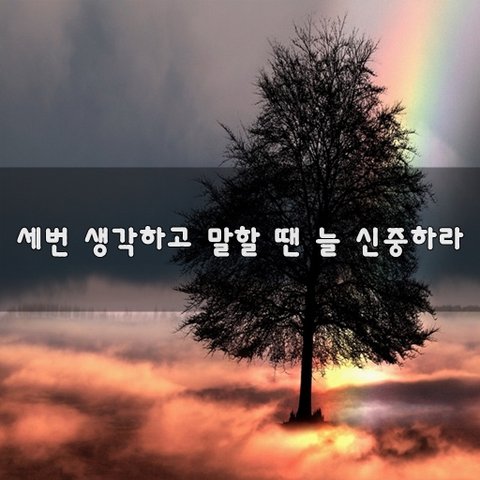 ♥ 세번 생각하고 말할 땐 늘 신중하라 ♥ 말 앞엔 3번 생각하고말 앞엔 늘 신중하라. 말 많으면 허물이 많아지고말 적으면 바보라도 지혜롭다. 남을 험담하면 자신의 인격을 드러내는 것이고 옆의 듣는 사람은 참고 들을 뿐이다. 자칫 남의 눈의 티끌은 보면서자기 눈의 들보는 보지 못하는 격 말은 오가지만 대화속의 꽃이 필수도, 쓴뿌리가 될 수도 있다. 작금의 시간 속에 말 달리듯 말하면 자신의 허물만 드러내게 된다. 남을 축복하면 내가 축복받고 저주하면 역시자기에게 돌아온다. 누워 침 뱉으면 어떻게 되는지잘 알면서도 입을 떠난 말이 어떻게 돌아 올지는 생각 못하는 바보가 있다. 경청 보다 좋은 말은 없고수다 보다 나쁜 말은 없다. 입으로 말을 전하지 말고가슴으로 마음을 전하라. 미담은 덕담이고 험담은 악담이다담談이라고 다 좋은 말이 아니다. 비난과 험담은 세 사람을 잃게 만든다자신과 듣는 사람 그리고 비난 받는 사람이다. 어리석은 이는 남을 비방하고 헐뜯지만 지혜로운 자는 그 말을 듣고 자신을 돌아보고 성찰한다. 남을 비방하면 평생 빈축을 사게 되고 반면 남을 칭찬하고 세워주면 미덕이 되어 축복의 통로가 된다. 자신의 입으로 관용의 등불을 밝혀주면 관계가 소통되고 회복되며 마음의 등불을 켜주게 된다. 혀 끝으로 내뱉는 말은 아첨이고 마음에서 우러나오는 말은 칭찬이다. 잘못된 논리로 사람을 설득시키려 들지 마라. 지나고 나면 남는 것은 적개심 뿐이다. 마음 밭이 옥토인 사람은 밝고 맑고 깨끗하고 틈실한 말씨를 뿌린다.