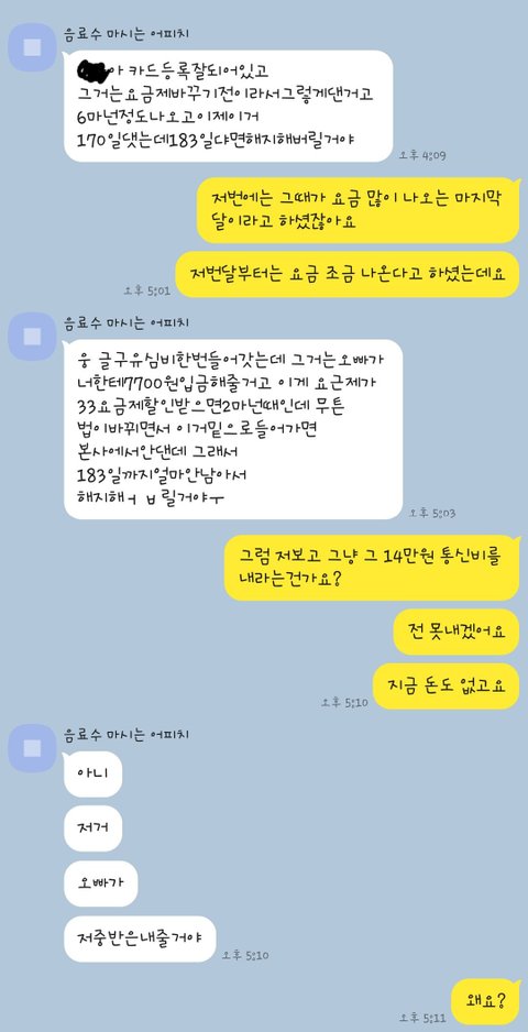 조카 개 얼척이 없어서 아니 내가 따로 5만원씩 긁는거 외에는 돈드는거 없다고 하지않았냐 갑자기 이제 와서 안쓰는 번호 요금을 내라는것도 이해안되고 나 돈도 없다 라고 함