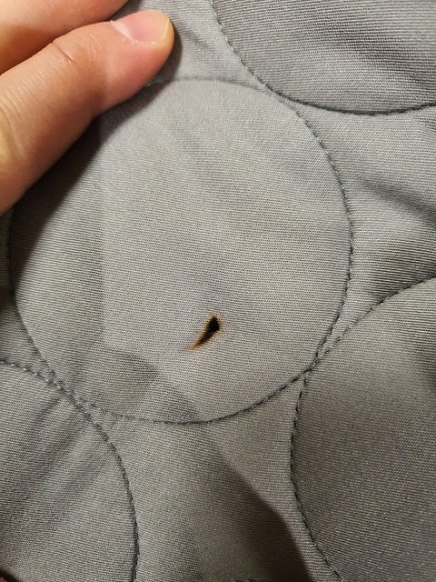 처음엔 뭐가 묻은 줄 알았으나 자세히 보니 과열로 인해 타서 구멍이 난 흔적이었습니다.