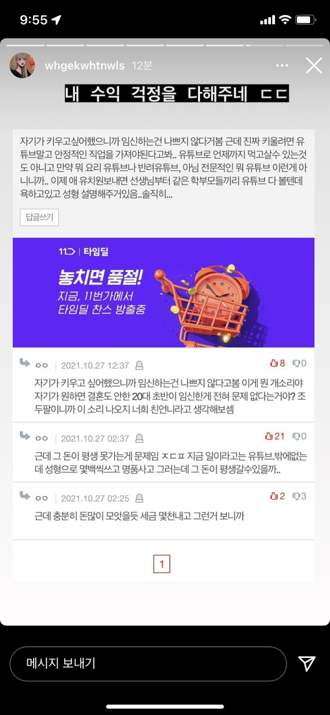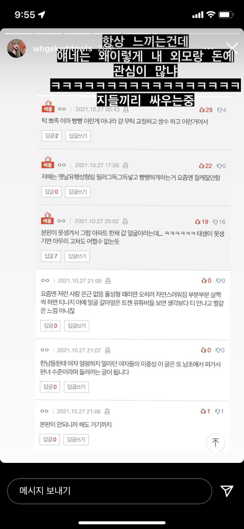 쟤 분명 저 스토리올리고 맘고생 엄청 할껄? 겉으로는 신경 안쓰는척하지만 일단 저런 글 올린다는거 자체가 신경쓴다는 뜻임