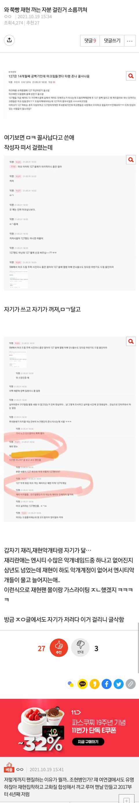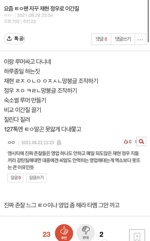 8월에 이미 누가 예견한 그대로임 숙소로 주작하는것도 저 둘이고 맨날 망붕글 톡선 올리는거도 저둘이고 태용은 천상계고 나머진 인간계고 태용이 엔시티 원탑 얼굴이고 태용이랑은 비교불가고 나머진 취향차래 그리고 태용만 까이는데 나머지 까이는척 하지말래 제일 얼굴 인성 영업 심하게 하는데 그냥 비호감 이미지인걸 어쩌라고ㅋㅋㅋㅋ개 ㅈ도 안먹히는 논리로 아직도 정치질하고 다니심