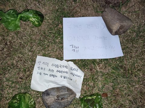 공원 한구석에 똥을 봉지에 모아두는 사람이 있어서 몇 글자 적어두었습니다