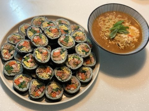 김밥. 너무 많이싸서 근처 사는 동생도 나눠주고 하루종일 먹었어요.