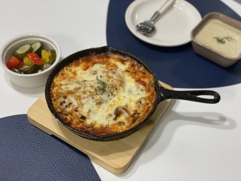 토마토 치즈 오븐 스파게티입니다. 치즈를 뿌려 오븐에 5분정도 더 돌려주면 치즈가 먹음직스럽게 녹아요.