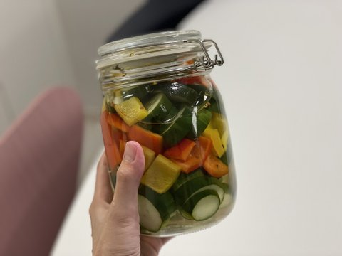 물/식초/설탕(1:1:1 비율)에 피클링스파이스, 월계수잎 넣고 팔팔 끓여줘서 유리병에 넣어주기만하면 끝입니다.