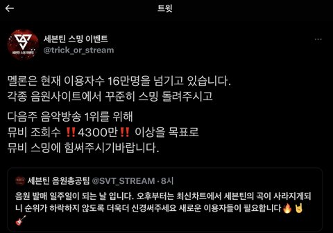 4300만 뷰를 꼭 넘겨야 함 우리 뮤스 화력이 너무너무 적어 제발 뮤스에 집중할 수 있게 아래버스랑 짹에 무한 독려 부탁해 +) 일요일에서 월요일로 넘어가는 00시 까지래!!