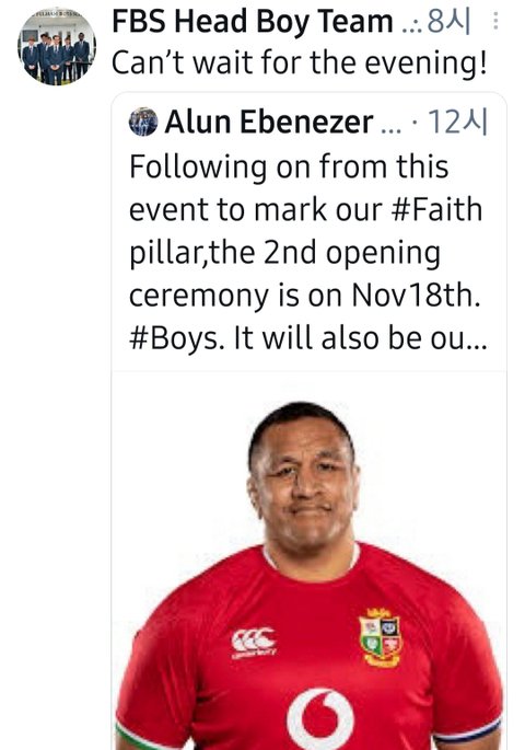 헤드보이 사진도 아니고 그냥 한 줄 트윗이지만 떡밥 가뭄기라 저거 타이핑하고 올리는 아르망 모습이라도 상상해 본다ㅠㅠㅠ 담주면 개학에 영상에 떡밥 __ 터지겠지만 아직은 가뭄이라 이것도 소중ㅠ 어? 근데 저 선수는 뉴질랜드 출신으로 잉글랜드 럭비 대표로 뛰고 있는 마코 부니폴라 아님? 아니 뭔 개학식에 럭비 국대까지 초청해ㅋㅋㅋ 근데 얘네는 뭔 개학식마다 축제를 허냐 저번 가을학기 개학식엔 합창단 부르더니ㅋㅋㅋ 이번엔 학기 시작도 아니고 걍 가을방학 끝나고 등교하는건데 또 성대한 개학식ㅋㅋㅋ 그것도 11월 초도 아니고 18일에ㅋㅋㅋ 여튼 교장샘 이사장님 흥 많아서 좋은 학교ㅋㅋㅋㅋㅋ