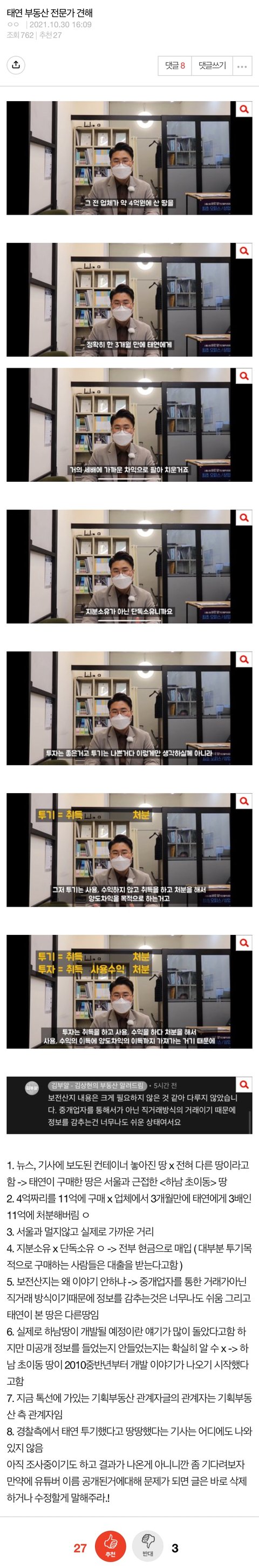 부동산 전문가가 태연 이번일에 대해 고찰한 영상이나 보고 얘기해라 무작정 뚜드려 패기에도 뭐한 상황이던데 전문가 말은 안믿고 기획부동산 그 사기꾼들이 하는 말이나 믿고있냐 니네는 ㅋㅋㅋ