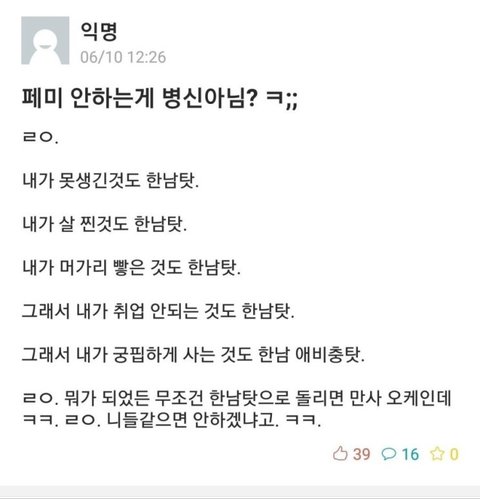 페미들이 하는 거 쭉 지켜봤는데 얘네처럼 세상 살면 ㅈㄴ 편하겠다는 생각 들더라. 자기가 잘못한거 1도 없고, 다 한남이랑 사회 탓하면서 걔네들이 잘못된거고 자기는 피해자라 하니까 ㅋㅋㅋㅋ 항상 지들이 불리하고 잘못한 ㅂㅅ짓은 남초한남들이 몰려와서 여혐할려고 주작했다고 우기면 되니까