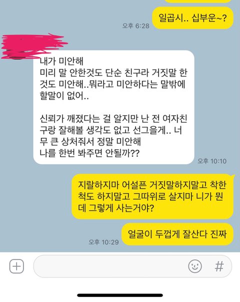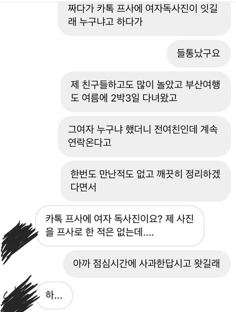 나 여자친구 있고 지금도 여자친구랑 있으니까 다시는 연락하지말라고 쇼를 하더군요.