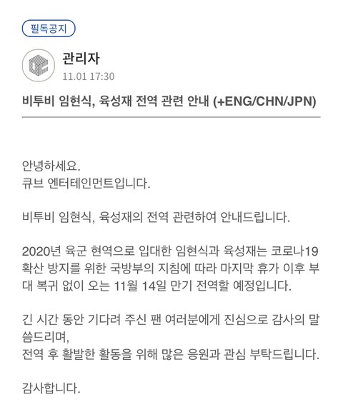 비투비 임현식, 육성재 전역 관련 안내