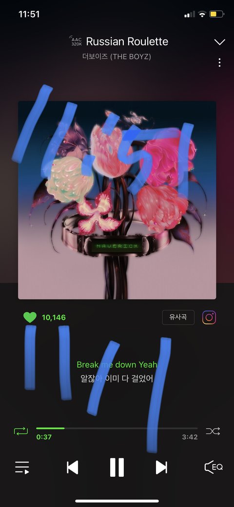 반복재생X 네모화살표O 멜론벅스지니 음소거O 플로 소리1이상