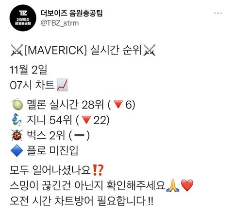 얘들아 일어나면 스밍 잘 돌아가고 있는지 확인해줘! 이제 순위 점점 떨어질 시간이니까 차트 방어 잘 하자 유지가 제일 중요해❤️