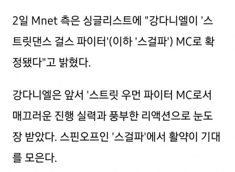 2일 스타뉴스 취재 결과, 강다니엘은 엠넷 음악프로그램 '스트릿댄스 걸스 파이터'(이하 '스걸파') MC로 출격한다.