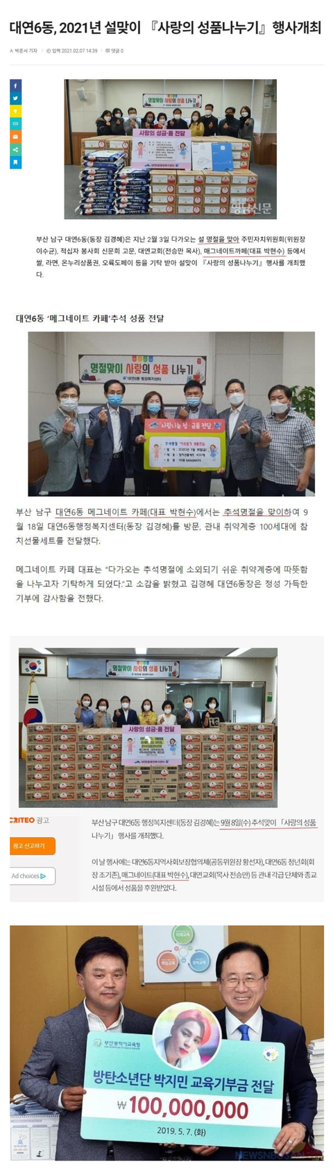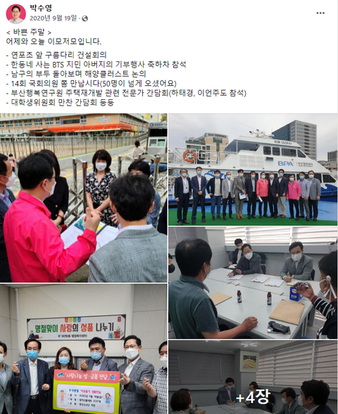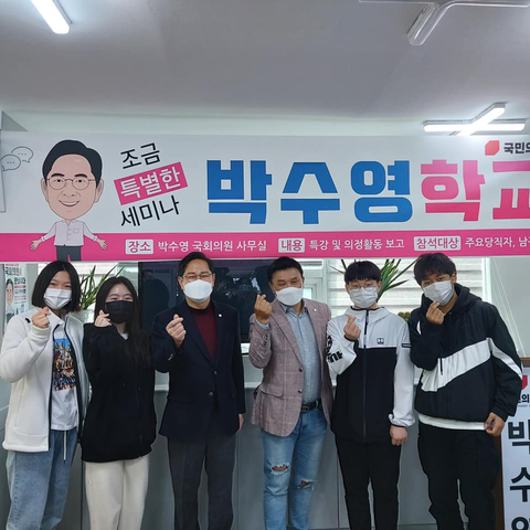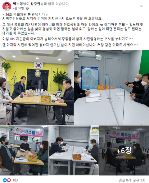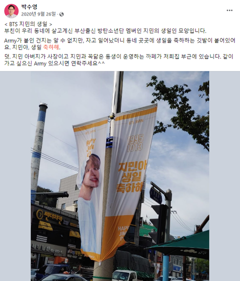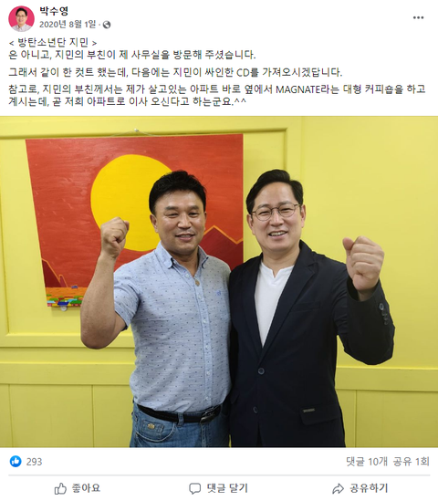 방탄소년단 지민 아버님이 부산 지역에서 기부하시면서 좋은일 많이 하시는데 지역구 국회의원인 국민의힘 박수영 의원님 페북에도 사진이 올라왔어같은 아파트 사시고 지민 아버님도 의원 사무소에 자주 놀라오시고의원님도 지민 아버님 카페에 놀러가실 정도로 친분이 두터우신것 같아