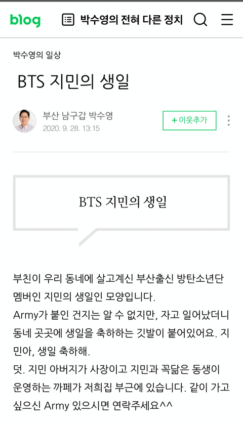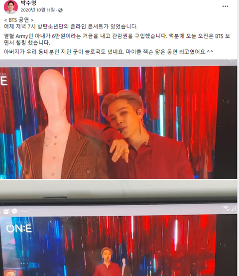의원님도 아미가 되셨는지 블로그에 방탄 지민 태그도 올리고 콘서트도 관람하시면서 아미 인증 해주셨음