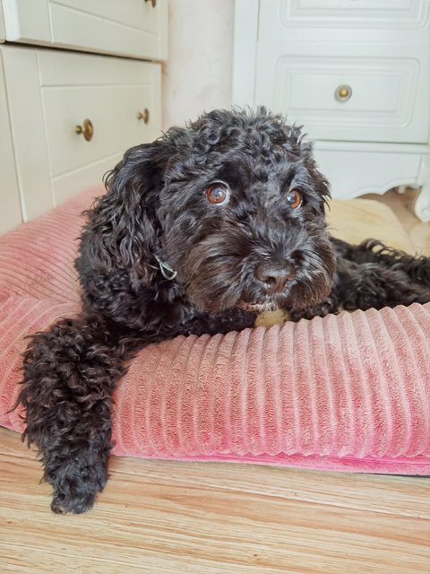 원래 삽살개처럼 눈이 가려질만큼 털이 긴데 집에서 조금씩 미용.해주고 보니 푸들이 섞인 아이가 아닌가 싶어요.