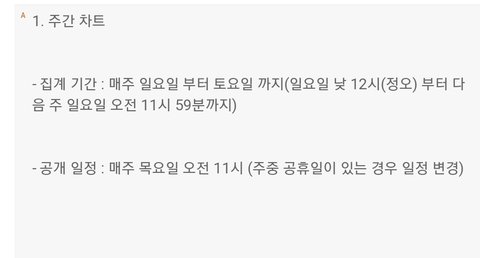 우리 총공한게 일요일 저녁인데 가.온차트 집계는 일요일 낮 12시까지임 어차피 음.중은 월욜 낮 12시까지 집계되니까 예측표때문에 연연할 거 없다고 알려주려고 그니까 음.중 실시간 투표 빡세게하자 물론 오늘 엠.카 투표도 까먹지 말고!!