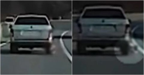 작은 물체 하나가 SUV 차량 뒤쪽에 매달려 끌려갑니다.