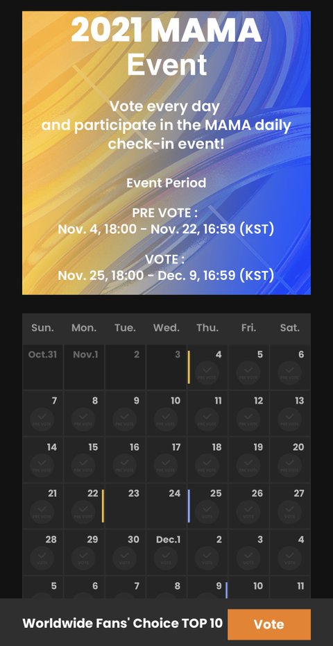 오늘부터 11월 22일까지 사전투표가 끝나면 20팀을 추려서 올리고 11월 25일부터 12월 9일까지 본선투표로 다시 10팀을 뽑아.