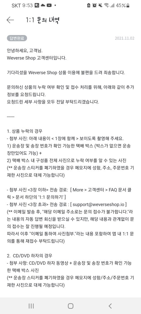 답변 받았는데 도대체 어떻게 박스에 붙어있는 스티커랑 구성품을 1장에 같이 찍어야 하는걸까... 문의 해본 캐럿들은 어떻게 찍어서 보냈니ㅠㅠ