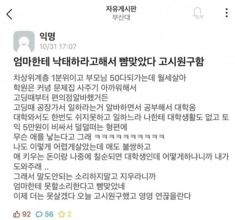 엄마한테 낙태하라고 해서 뺨맞은 남자..