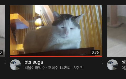 고양이 유튜브인데 ㅋㅋㅋㅋㅋ뭐 방탄 슈가 닮은 고양이 이것도 아니고 걍 bts suga 라고….너무 웃김 ㅜㅜㅜ